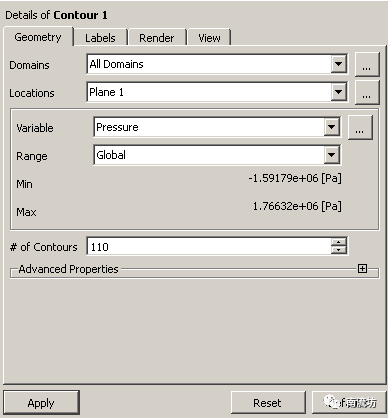 (5)在Geometry(几何)选项卡中Locations选择Plane 1,Variable选择Pressure,单击Apply按钮创建压力云图。