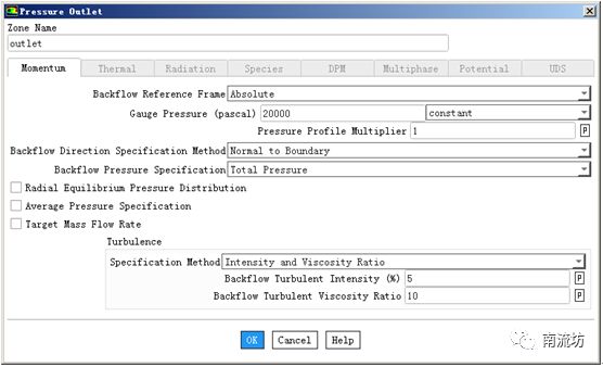 (3)在边界条件面板中,双击设置outlet,gauge pressure输入20000,单击OK按钮确认退出。