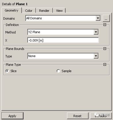 (3)在Geometry(几何)选项卡中Method选择YZ Plane,X坐标取值设定为0.009,单位为m,单击Apply按钮创建平面。