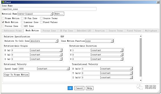 (1)在Cell Zone Conditions面板中,双击impeller_zone,弹出计算域设置对话框,勾选Mesh Motion,在Rotation-Axis Origin中输入(0,0,0),在Rotation-Axis Direction中输入(1,0,0),在Speed中输入1000rpm,单击OK按钮并关闭对话框。
