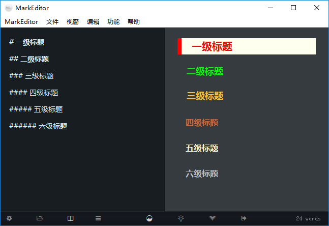 # 一级标题 ## 二级标题 ### 三级标题 #### 四级标题 ##### 五级标题 ###### 六级标题