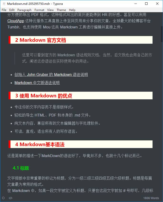 在前面提到,Markdown 是一种用来写作的轻量级「标记语言」,它用简洁的语法代替排版,而不像一般我们用的字处理软件 Word 或 Pages 有大量的排版、字体设置。它使我们专心于码字,用「标记」语法,来代替常见的排版格式。例如此文从内容到格式,甚至插图,键盘就可以通通搞定了。目前来看,支持 Markdown 语法的编辑器有很多,包括很多网站(例如简书)也支持了 Markdown 的文字录入。Markdown 从写作到完成,导出格式随心所欲,你可以导出 HTML 格式的文件用来网站发布,也可以十分方便的导出 PDF 格式,这种格式写出的简历更能得到 HR 的好感。甚至可以利用 CloudApp 这种云服务工具直接上传至网页用来分享你的文章,全球最大的轻博客平台 Tumblr,也支持使用 Mou 这类 Markdown 工具进行编辑并直接上传。
