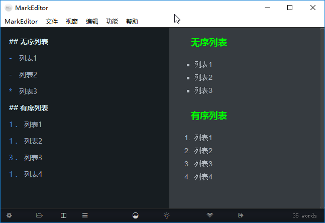 列表也是一种常用的文档格式。Markdown中的列表分为有序列表和无序列表。无序列表只需要在文字前加上 - 或 * 即可,有序列表则直接在文字前加 1. 2. 3. 符号要和文字之间加上一个字符的空格。