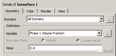 (2)单击任务栏中Local->Isosurface按钮,弹出等值面设定面板。Variable选择Phase 1.Volume Fraction,在Value中填入0.8,单击Apply按钮确认。