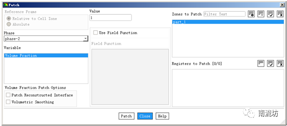 (2)在Solution Initialization(初始化设置)面板中,单击Patch按钮,弹出Patch对话框,Phase选择phase-2,Variable中选择Volume Fraction,在Value中填入1,单击Patch按钮。