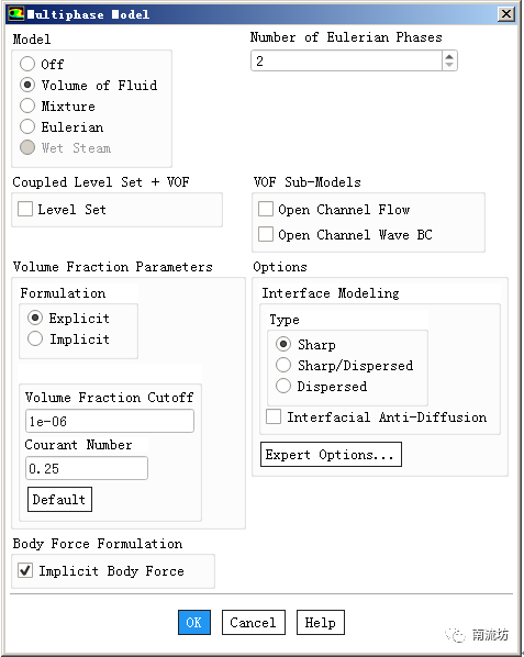 (2)在模型设定面板Models中双击Multiphase按钮,弹出Multiphase Model(多相流模型)对话框,选择VOF,勾选Implicit Body Force,单击OK按钮确认并关闭对话框。