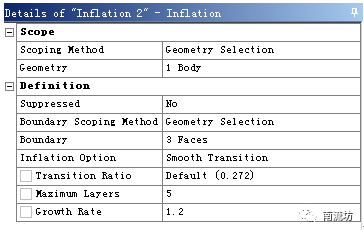 (3)右键单击模型树中Mesh选项,依次选择Mesh→Insert→Inflation。boundary选择管道壁面,在Maximum Layers中输入5。