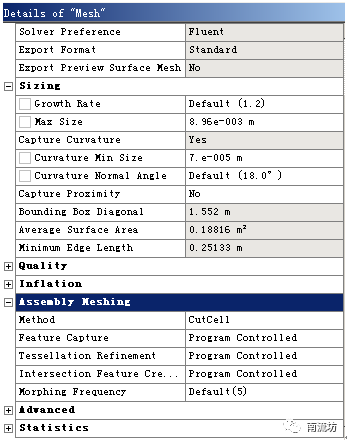 (4)网格参数设置,在Assembly Meshing中,Method选择CutCell,在Sizing中,Max Size填入8.96e-03,Curvature Min Size填入7e-05在Quality中,Smoothing选择High。