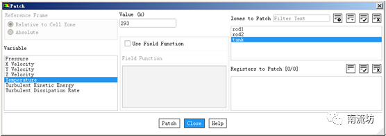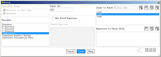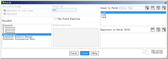 (2)在Solution Initialization(初始化设置)面板中,单击Patch按钮,弹出Patch对话框,在Zone to Patch中选择rod1,Variable中选择Temperature,在Value中填入650,单击Patch按钮。