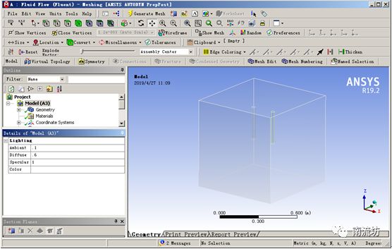(1)双击A3栏Mesh项,进入Meshing界面,在该界面下进行模型的网格划分。