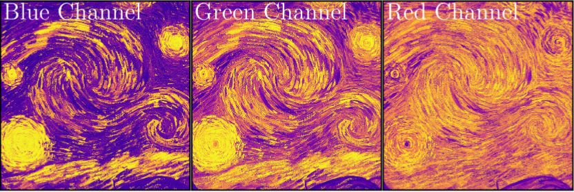 Beattie和Kriel将注意力集中在《星夜》中心的旋涡上。首先,他们在画的天空部分选取了一块正方形的区域,再用三种不同的颜色“频道”创建了一些二维的示意图。