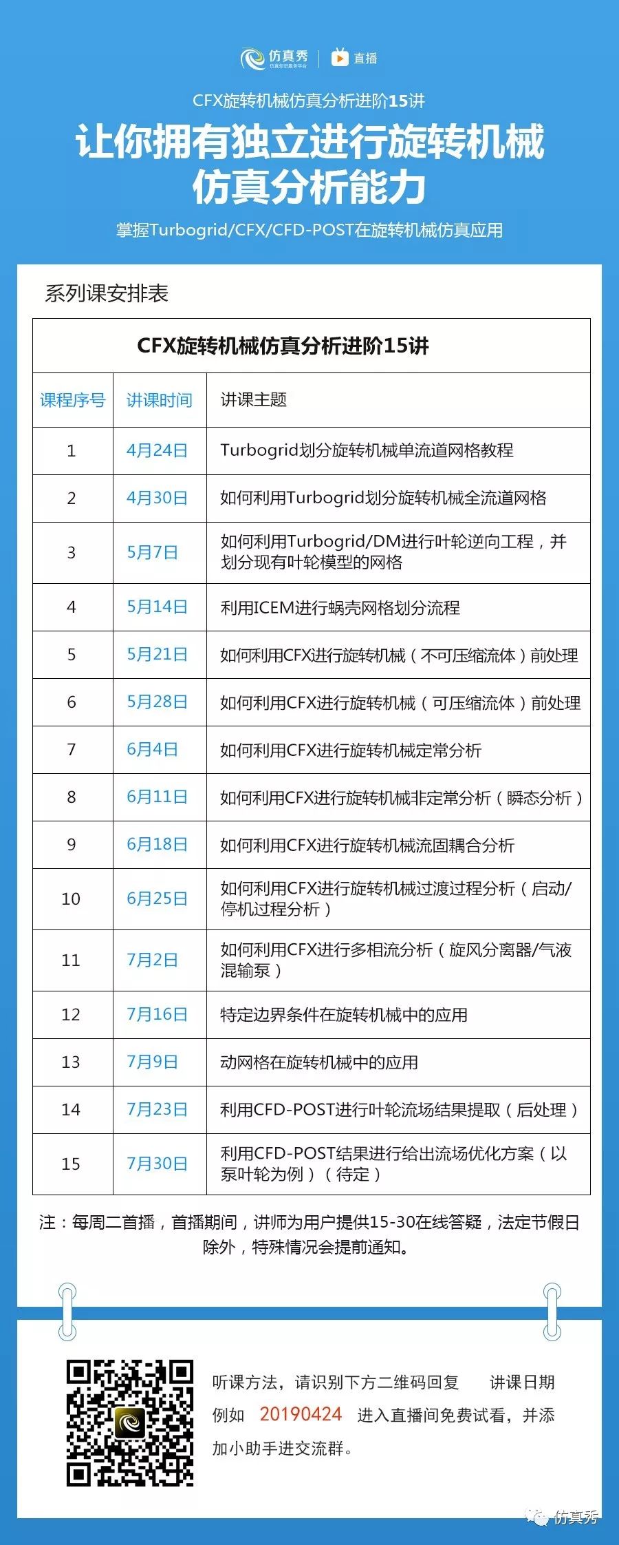 受仿真秀平台的邀请,自2019年4月24日起,每周二晚上20点(第一期课安排在周三),特殊情况除外,我将在仿真秀-知识讲堂直播间分享《CFX旋转机械仿真分析进阶15讲,掌握旋转机械仿真分析能力》,首播期间,我会为听众提供15-30分钟在线免费答疑,希望和大家一起学习CFX旋转机械专题内容,以下是整个课程的排期表,以实际播放为准。
