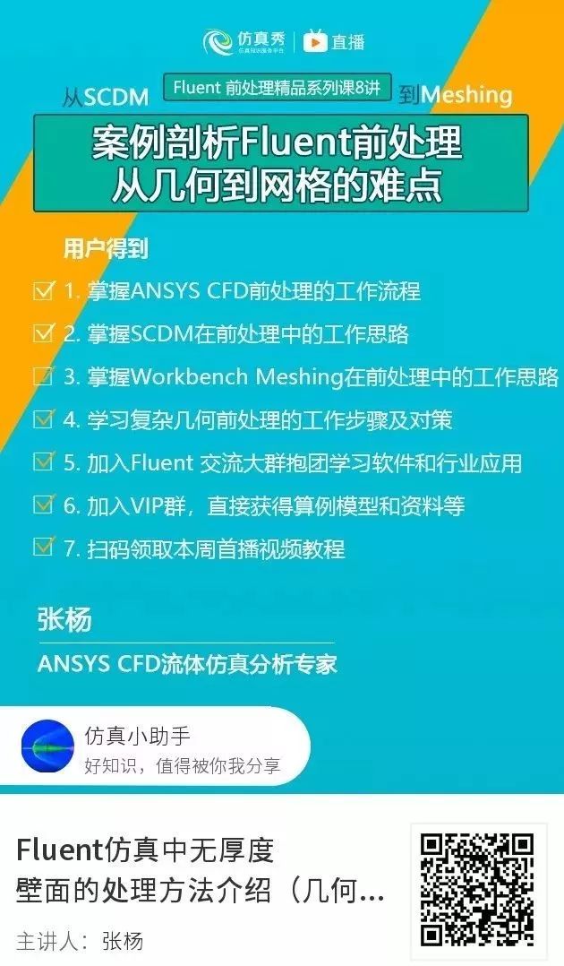 读者福利:2019年4月9日19时(今晚),仿真秀专栏作者-张杨老师在仿真秀知识讲堂首播《Fluent仿真中无厚度壁面的处理方法介绍(几何+网格)》并提供15-20分钟在线免费答疑,欢迎扫码领课来互动学习。