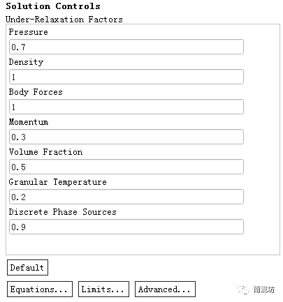 (1)单击主菜单中Solving→Controls→Controls按钮,弹出Solution Controls(松弛因子控制)面板。在Under-Relaxation Factor中Pressure中填入0.7,Momentum中填入0.3。