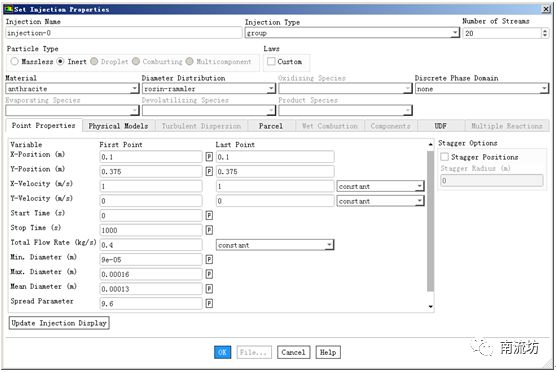 Injection Type选择group,Numbers of Streams填入20,Diameter Distribution选择rosin-rammler,X-Position的First Point和Last Point均填入0.1,Y-Position的First Point和Last Point均填入0.375,X-Velocity的First Point和Last Point均填入1,Stop Time填入1000,Total Flow Rate填入0.4,Min. Diameter填入9e-05,Max. Diameter填入0.00016,Mean. Diameter填入0.00013,Spread Parameter填入9.6。