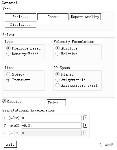 (2)单击命令结构树中General按钮,弹出General(总体模型设定)面板。在SolverTime中选择Transient。勾选Gravity,在Y中填入-9.81m/s2。