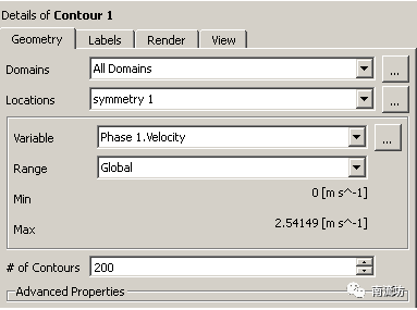 (3)在Geometry(几何)选项卡中Locations选择symmetry 1,Variable选择Velocity,单击Apply按钮创建速度云图。