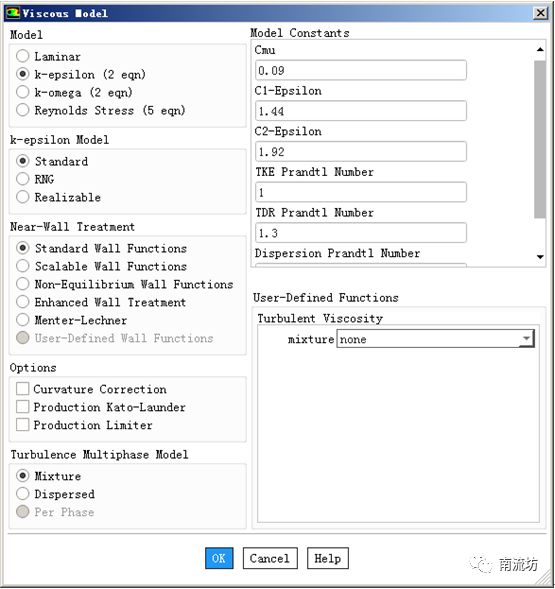 (7)在模型设定面板Models中双击Viscous按钮,弹出Viscous Model(湍流模型)对话框,在Model中选择k-epsilon(2eqn),单击OK按钮确认并关闭对话框。