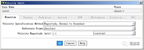 (2)在边界条件面板中,选择inlet,Phase选择phase-1,单击Edit按钮弹出边界条件设置对话框。Velocity Magnitude输入1.1,单击OK按钮确认退出。