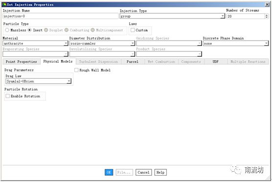 (5)在Discrete Phase Model对话框中,单击Injections按钮,弹出Injections对话框,单击Create按钮弹出Set Injection Properties对话框。