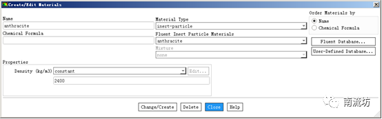 (1)单击主菜单中Setting Up Physics→Materials→Create/Edit,弹出Create/Edit Materials(材料)对话框。选择anthracite,在Density处填入2400,单击Change/Create按钮并关闭Fluent Database Materials对话框。
