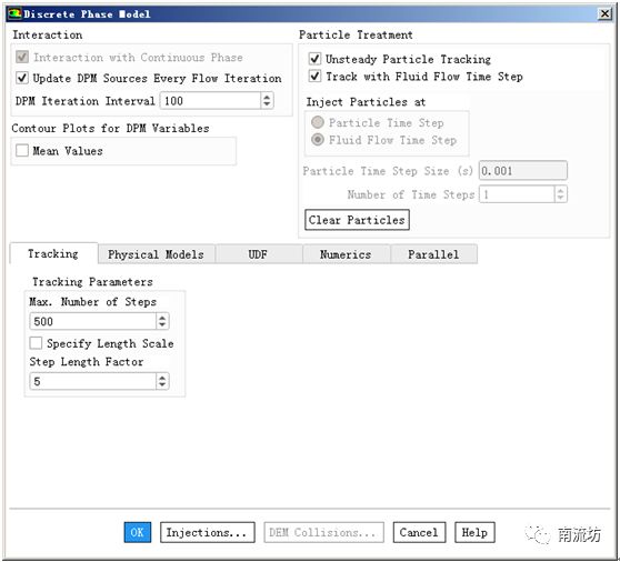 (4)在模型设定面板Models中双击Discrete Phase按钮,弹出Discrete Phase Model(离散相模型)对话框,在DPM Interation Interval处输入100。