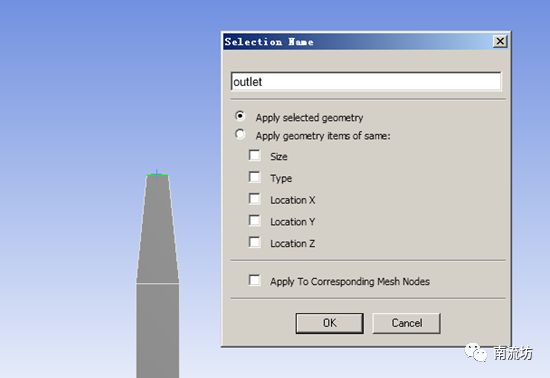 (2)依次右键选择模型下边界和上边界,在弹出的如图16-79所示的快捷菜单中选择Create Named Selection,弹出如图16-80所示的Selection Name对话框,输入名称inlet和outlet,单击OK按钮确认。