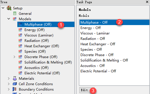 选择模型树节点Multiphase,选中右侧列表项Multiphase-Off,点击下方按钮Edit…