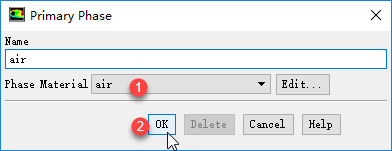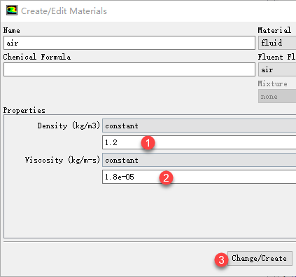 设置Air的属性,设置Density为1.2,粘度为1.8e-5