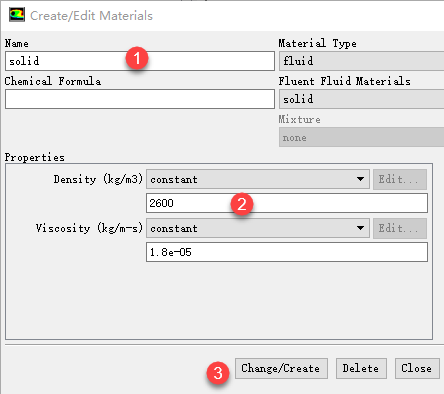 添加Solid材料,设置Density为2600,粘度为1.7894e-5