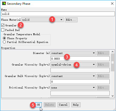 设置第二相为Solids,激活选项Granlar,设置颗粒直径为0.0003m,颗粒粘度为Syamlal-obrien,其他参数保持默认设置