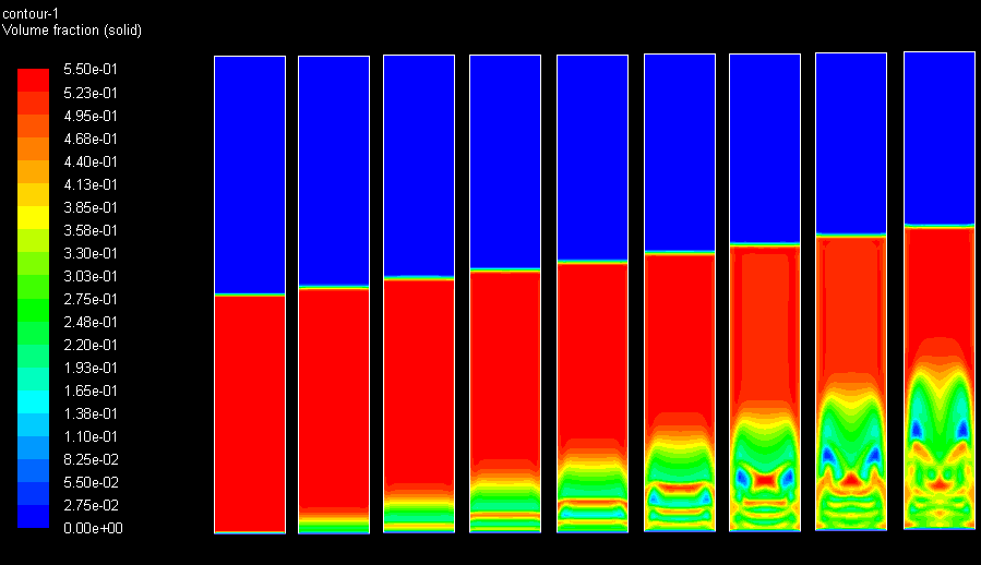 (时间有限,并未计算完毕,下图展示的是0、0.1、0.2、0.3、0.4、0.5、0.6、0.7、0.8 s时刻固相分布。)
