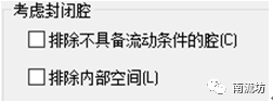 选中复选款,可以排除对分析结果影响较小的不具备流动条件的腔(用于内部和外部分析中忽略未指定边界条件的封闭内部腔体)或者内部空间(用于外部分析中忽略封闭的内部空间),以达到减少复杂模型的计算量。
