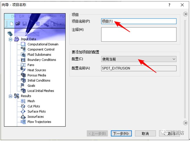 设置项目名称和注释(可用来区分不同分析项目中的变量或者目标对象)。项目配置中配置有使用当前、选择、新建三个选项,由于窗口中已经准备好需要仿真的模型,所以此处直接设置使用当前。
