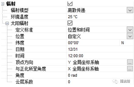 只要在耦合热交换分子中涉及到表面辐射,就选中辐射复选框。在一些强迫散热的工况下,为了减少计算量可不进行辐射计算,但此时仿真的结果会偏保守。