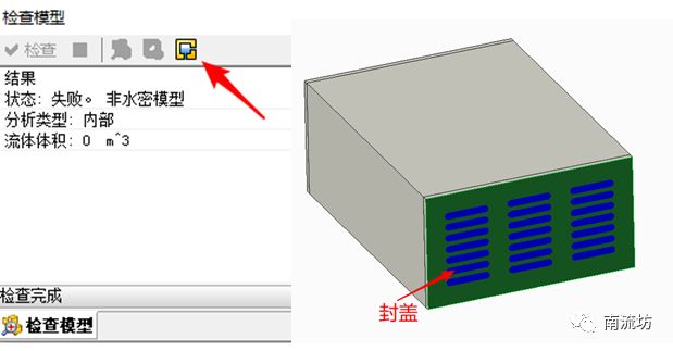 分析类型有内部和外部区分。内部流动分析涉及以固体外表面为边界的流动,如管道内、储罐内等相对比较封闭的空间内流动。若使用内部分析,必须保证模型完全闭合。否则,在使用【检查模型】时,出现非水密模型错误。解决办法:可通过【泄漏跟踪】定位模型中实体之间的间隙和开口,并使用【创建封盖】来封闭模型开口,直接选择需要封闭的面,软件自动生成封盖模型。如果无法选择封盖的面,则需要使用三维设计软件来封闭模型。外部流动分析是计算域边界的流动,在此情况下,模型完全被流体包围,比如,飞机、汽车、家电等。如同时分析内部和外部的流动,则选择外部分析。