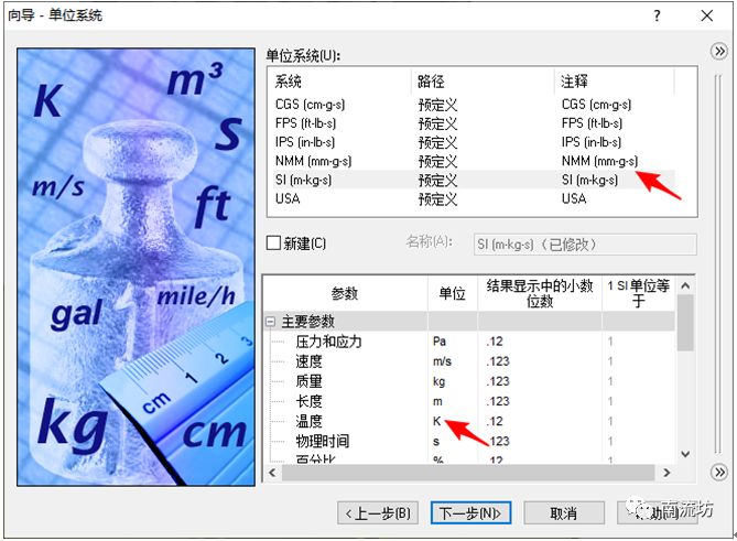 一般选择与实际使用最接近的SI(国际单位系统),再按照习惯调整所选的单位系统,如,把主要参数里温度的单位由K设置为℃,其他保持可不变。当然,还可以新建与自己使用习惯完全匹配的单位系统,这样方便以后调用。