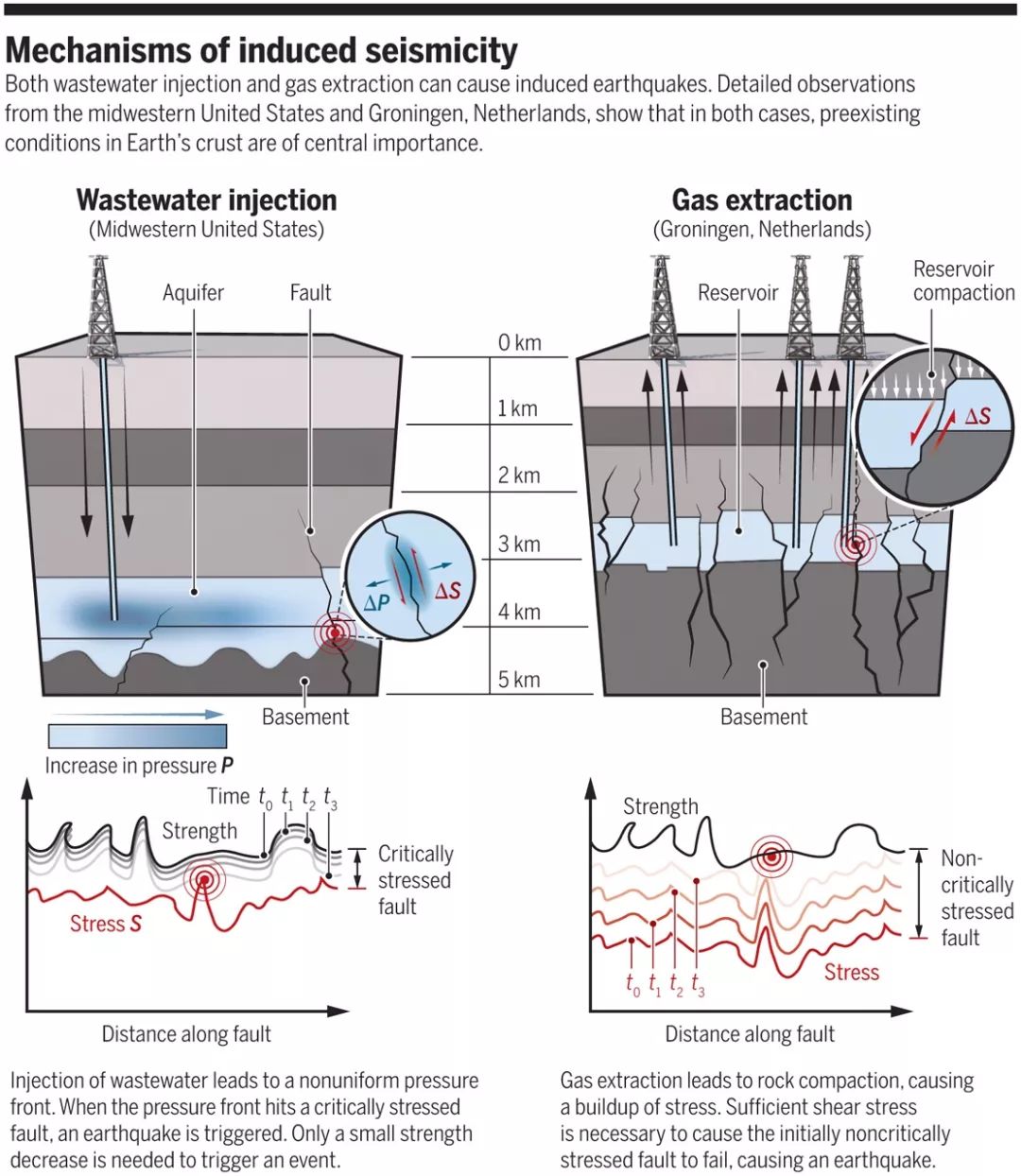 五十年前,地质学家就确定了地底深层的流体注入会导致孔隙压力在原有断层中上升,从而降低断层的强度并可能导致其失效。相反,在深层进行流体开采则会降低孔隙压力,从而导致岩石层的压实(compaction);上升的岩石压力会导致原有断层的失效。