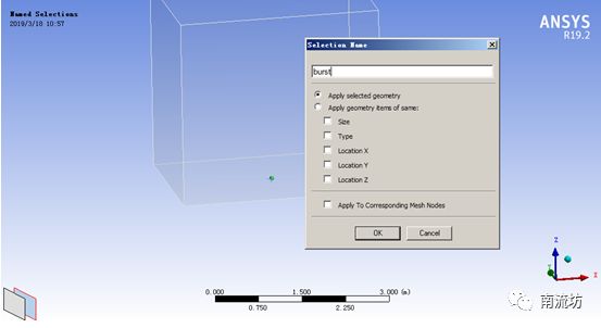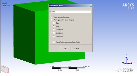 (2)右键模型外部五个平面,在弹出的快捷菜单中选择Create Named Selection,弹出的Selection Name对话框,输入名称Outlet,单击OK按钮确认。