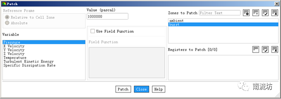 (2)在Solution Initialization(初始化设置)面板中,单击Patch按钮,弹出Patch对话框,在Zone to Patch中选择ambient,Variable中选择Pressure,在Value中填入101325,单击Patch按钮。在Zone to Patch中选择burst,Variable中选择Pressure,在Value中填入1000000,单击Patch按钮。