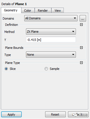 (3)在Geometry(几何)选项卡中Method选择ZX Plane,Y坐标取值设定为-0.415,单位为m,单击Apply按钮创建平面