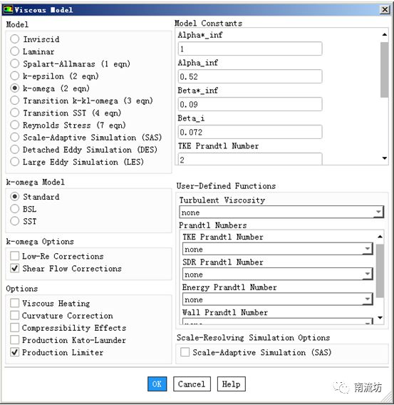 (4)在模型设定面板Models中双击Viscous按钮,弹出Viscous Model(湍流模型)对话框,在Model中选择k-omega(2eqn),单击OK按钮确认并关闭对话框。