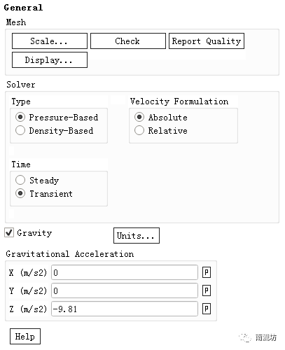 (2)单击命令结构树中General按钮,弹出General(总体模型设定)面板。在SolverTime中选择Transient,勾选Gravity,在Z中填入-9.81m/s2。