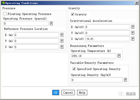 (1)单击主菜单中Setting Up Physics→Zones→Cell Zone Conditions面板。单击Operating Conditions按钮弹出Operating Conditions对话框,在Operating Pressure中填入0,勾选Specified Operating Density,在Operating Density中填入0,单击OK按钮并关闭对话框。