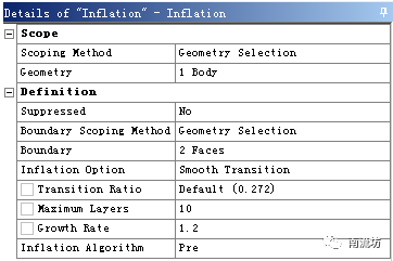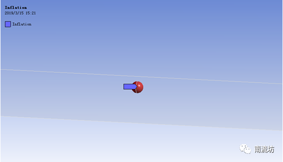 (6)右键单击模型树中Mesh选项,依次选择Mesh→Insert→Inflation。在Geometry中选择计算域中球型区域,Boundary选择球的两个曲面,在Maximum Layers中输入10。