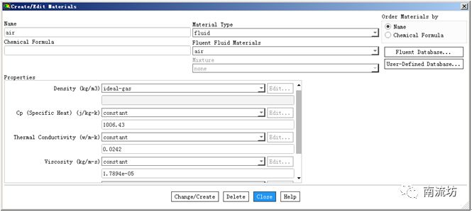 (1)单击主菜单中Setting Up Physics→Materials→Create/Edit,弹出Create/Edit Materials(材料)对话框。Density选择ideal-gas,单击Change/Create按钮并关闭Fluent Database Materials对话框。