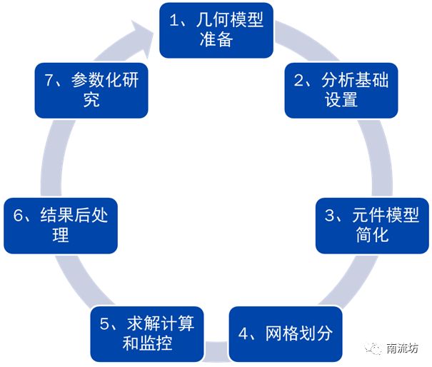 其一般的仿真流程如下,后续将围绕着以下七点展开,最后通过几个典型的案例,完整展示整个分析过程。
