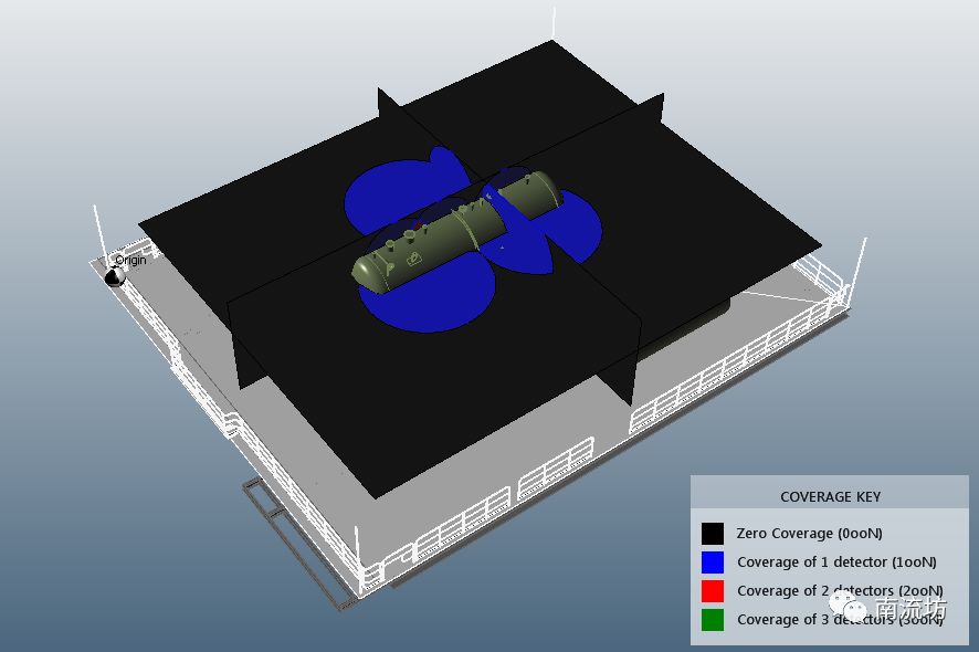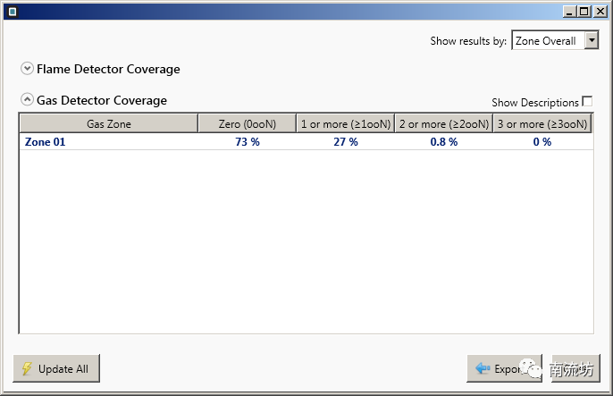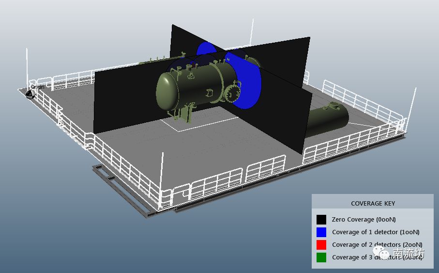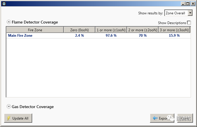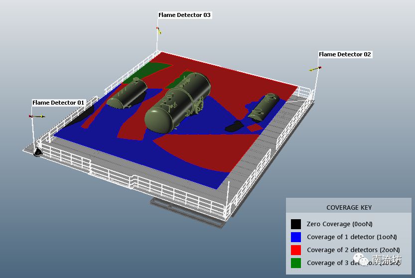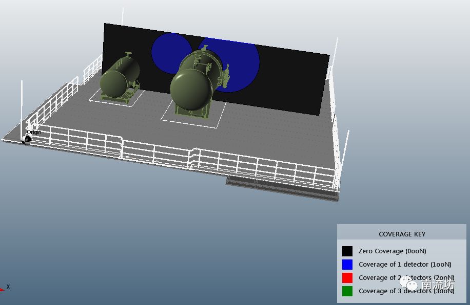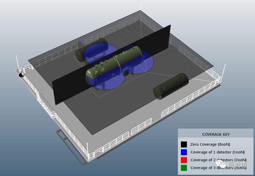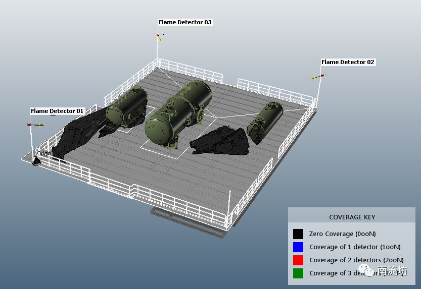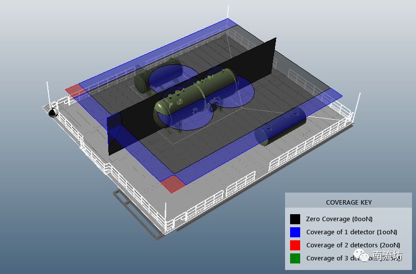 (1)单击工具栏中Show Coverage Results 按钮,可以看到气体扩散区内被不同数量探测器监测到的区域百分比 。