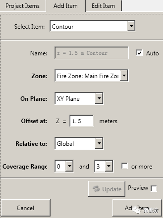 (1)在Add Item选项卡中,Select Item选择Contour,Zone选择Fire Zone: Main Fire Zone,On Plane选择XY Plane,Offset at: Z=填入3.5,Relative to选择Global,Converage Range选择0 and 3,单击Add Item确认。