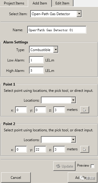 (1)在Add Item选项卡中,Select Item选择Open-Path Gas Detector,Name填入Open-Path Gas Detector 01,在Point1中Location坐标位置填入(0,0,3),在Point2中Location坐标位置填入(0,22,3),单击Add Item确认。